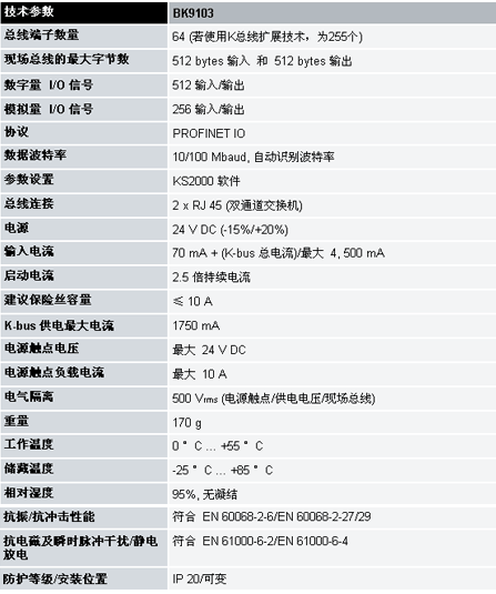 BK9103總線耦合器可將模塊化可擴(kuò)展的總線端子連接到PROFINET網(wǎng)絡(luò)中。一個(gè)節(jié)點(diǎn)包括一個(gè)總線耦合器、1 - 64 個(gè)任意數(shù)量的端子以及一個(gè)末端端子組成。